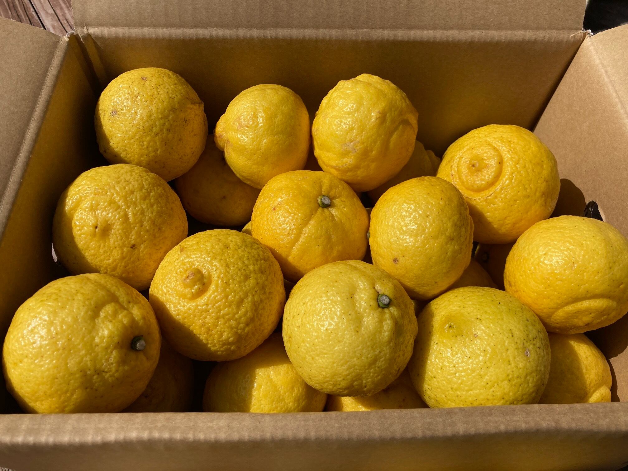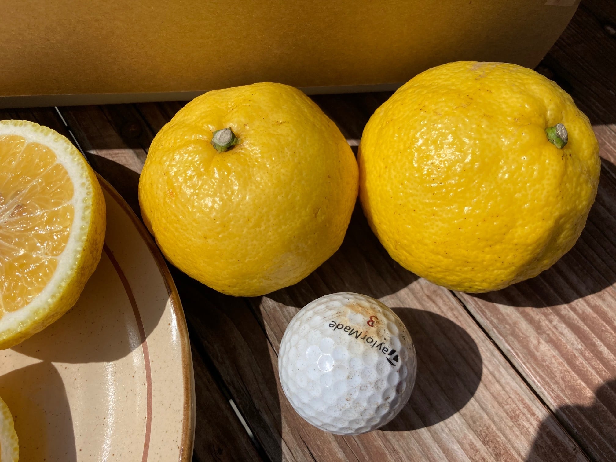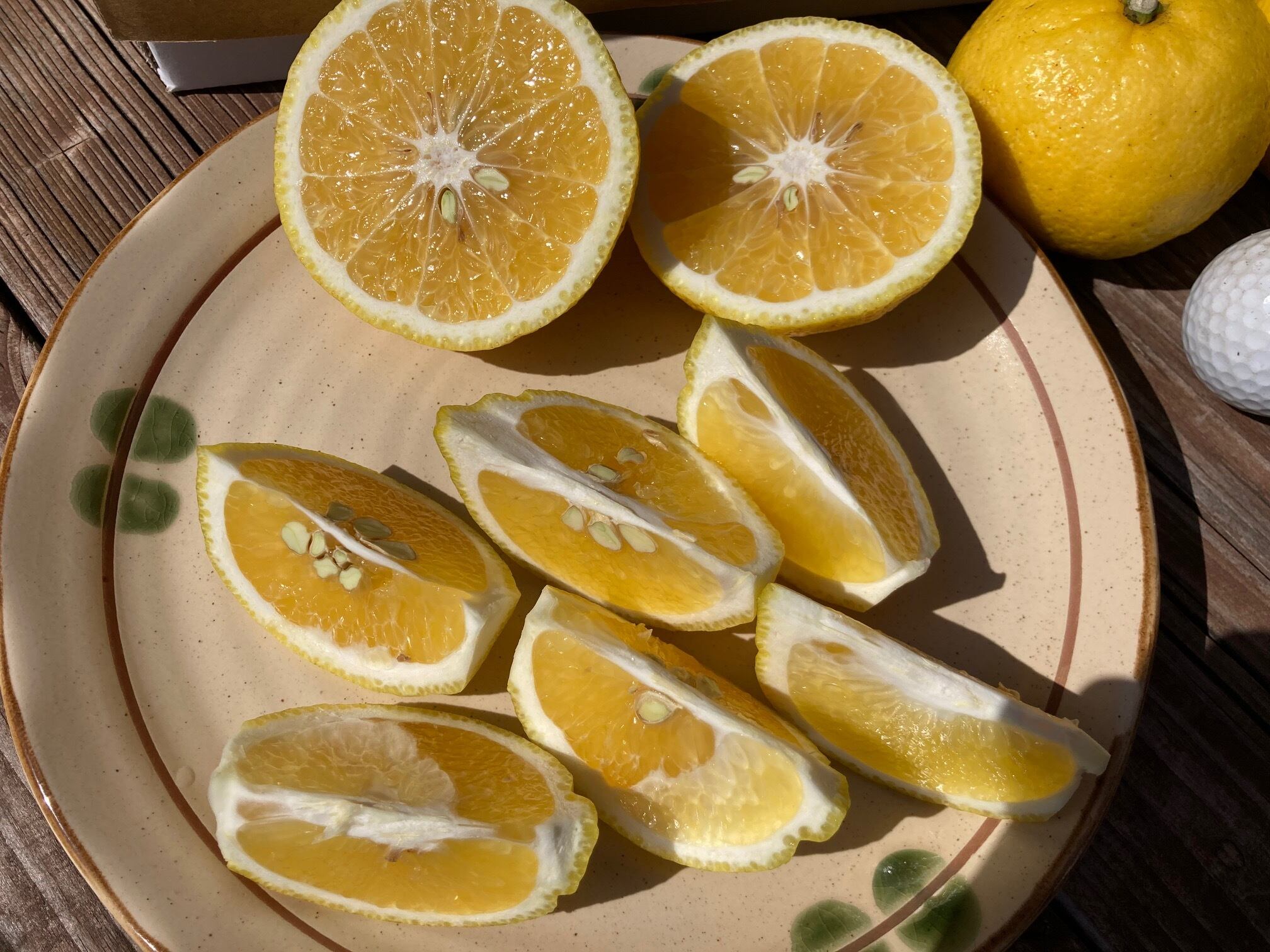 日向夏(ニューサマーオレンジ)の自然交雑種で外皮は黄色く硬い。見た目に反して酸味が殆んど無くしっかりと甘さがある。試食すると見た目とのギャップもありお土産の人気商品!